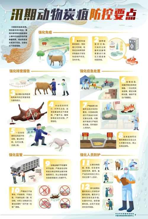 汛期动物炭疽防控技术要点 近期,我国多地出现持续强降雨天气,部分地区发生洪涝灾害。洪涝灾害后,炭疽疫源地土壤中的炭疽芽孢易暴露地表,污染环境,动物炭疽发生和流行风险增大。应强化相关防疫措施。 强免疫,筑牢保护屏障 在炭疽新老疫源地和牛羊调运频繁地区,要强化牛羊免疫工作,确保牛羊处于有效免疫保护状态。其他地区新引进牛羊,尤其是从炭疽新老疫源地引入牛羊的,应加强免疫。对江河流域、地势低洼地带等高风险区域饲养牛羊的,必要时应进行紧急免疫。接种后疫苗的空瓶、污染的注射器和容器等需要进行高压灭菌或者彻底焚烧。及时了解掌握当地汛情情况,强化炭疽疫情风险研判。 强排查,及时发现疫情隐患 在重点监测疫源地和高风险区,要立即开展一次紧急排查工作,后续要加大排查力度和频次。密切关注养殖、交易等重点环节,要求各类主体一旦发现病死及死因不明牛羊,要立即向当地相关部门报告,对出现突然死亡、天然孔出血、血液呈酱油色且不易凝固、尸僵不全、腹膨胀等症状的牛羊,坚决落实不剖检、不宰食、不出售制度。 快处置,确保疫情不扩散 一旦出现突发疫情,要坚决果断处置,确保不发生扩散蔓延。要对发病牛羊进行不放血扑杀;严格按照《炭疽防治技术规范》要求,对病死牛羊进行无害化处理;对圈舍环境进行彻底消毒,并做好人员防护。在病死牛羊等掩埋点应设立永久性警示标志,禁止在周边放牧。加强疫苗、消毒药等应急物资储备。 强监管,防止染疫动物流出 严格开展产地检疫,在炭疽新老疫源地,要详细了解既往养殖、治疗等情况;在其他区域,要了解牛羊养殖场2个月内是否有异常死亡等情况,坚决落实产地检疫各项要求。加强运输环节和屠宰环节监管,严格查验动物检疫合格证明和运载车辆备案情况,防止染疫或疑似染疫牛羊进入流通环节。加强落地报告制度监管。 重宣传,做好人员防护 坚持正面宣传、科学宣传,引导公众科学认知炭疽,增强防疫和防护意识,消除恐慌心理。指导从事动物防疫、检疫监管、实验室检测和饲养、屠宰、皮张加工等人员做好个人防护。参与疫情处置的有关人员要穿防护服和胶靴,戴防护口罩和双层乳胶手套;处置完毕后,接受健康检查;发现问题的,要及时就医。