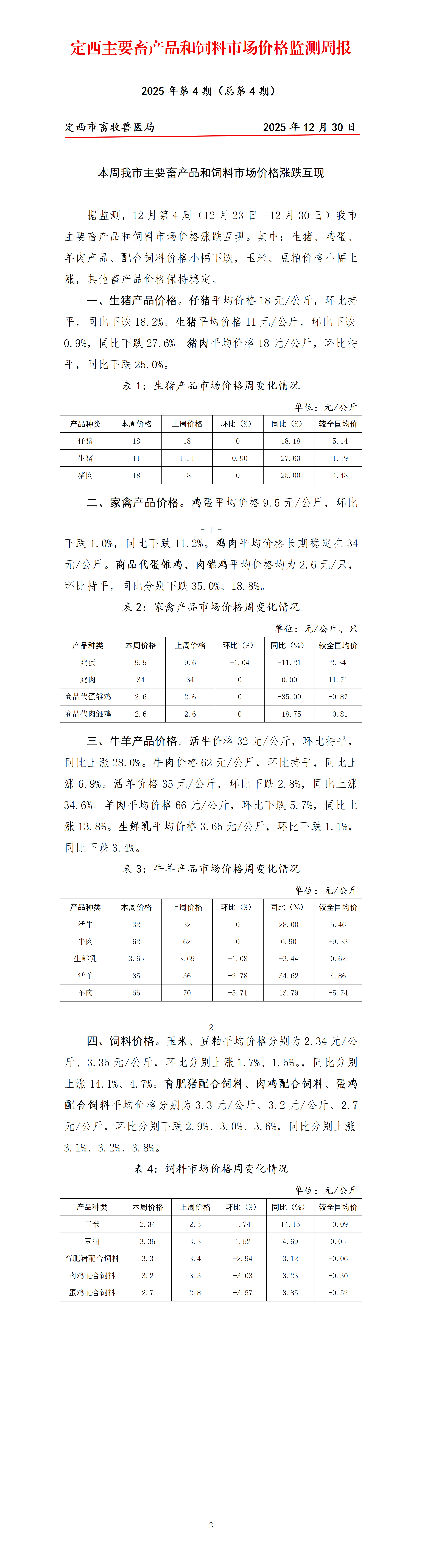12月第4周我市主要畜产品和饲料市场价格涨跌互现