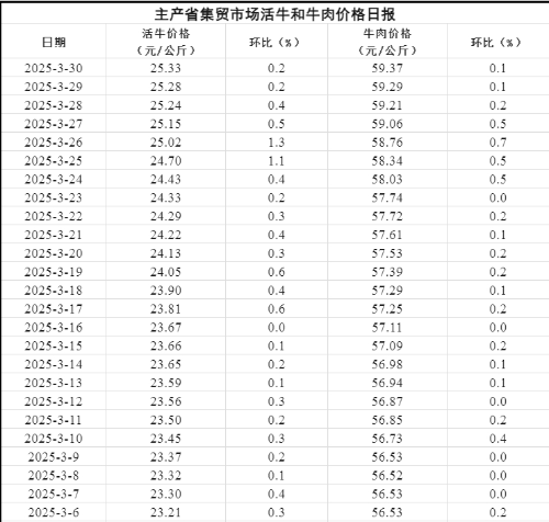 监测预警 据农业农村部监测,2025年3月30日,主产省集贸市场活牛价格25.33元/公斤,同比下跌2.3%,环比上涨0.2%,自3月2日起连续上涨29天,累计上涨2.62元,涨幅11.5%;牛肉价格59.37元/公斤,同比下跌10.5%,环比上涨0.1%,自3月2日起震荡上行,累计上涨3.34元,涨幅6.0%。
