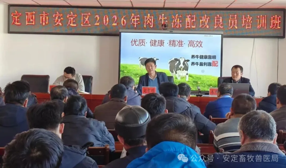 为持续提升安定区肉牛品种改良技术水平,加快优良品种推广步伐,着力打造一支业务精湛、技术过硬、服务高效的肉牛冻配改良专业队伍,为全区肉牛产业高质量发展注入强劲动力,近日,定西市安定区畜牧兽医局精心组织了2026年肉牛冻配改良员培训班,各基层畜牧兽医站站长及全区肉牛冻配改良骨干人员共计60余人齐聚一堂,共同参与此次技能提升培训。